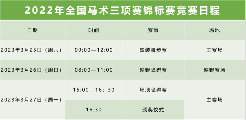 2022年全国马术三项赛锦标赛原定于2022年11月1日至3日在陕西省西咸新区秦汉新城秦汉国际马术中心举办,现延期至2023年3月25日(周六)-27日(周一),地点不变。为了赛事的顺利举办和大家能有更好的观赛体验,现将相关情况说明如下:
