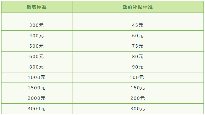 2023年度居民养老保险费缴费标准为300元、400元、500元、600元、800元、1000元、1500元、2000元和3000元等9个档次(最低缴费档次以当地政府规定为准)。政府按照缴费档次,分别对缴费人员给予30元-300元的补贴,多缴多补,多缴多领。最低缴费标准以各市(区)公布的缴费政策为准。