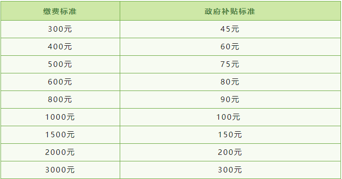 征缴标准:2023年度居民养老保险费缴费标准为300元、400元、500元、600元、800元、1000元、1500元、2000元和3000元等9个档次(最低缴费档次以当地政府规定为准)。政府按照缴费档次,分别对缴费人员给予30元-300元的补贴,多缴多补,多缴多领。最低缴费标准以各市(区)公布的缴费政策为准。