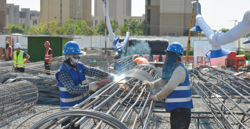 7月4日,西咸新区·秦汉大健康产业园片区萧何路安置房项目现场,工人们正在进行支护桩钢筋笼焊接和钻孔灌注作业,机械轰鸣和焊枪发出的蓝光交相辉映,一派繁忙的建设场景。
