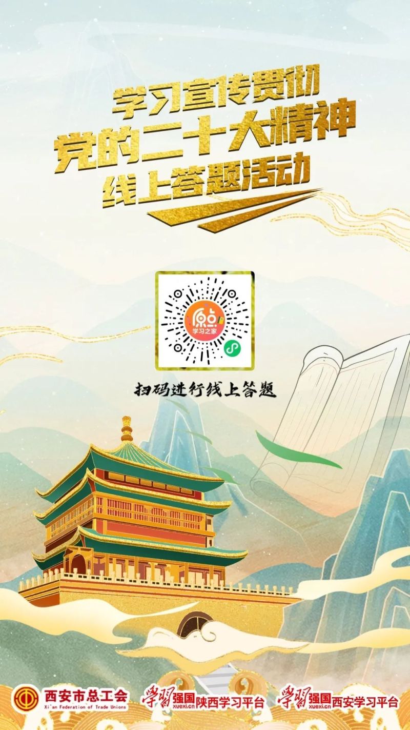 为深入学习宣传贯彻党的二十大精神,引导全市党员干部、市民群众深刻领悟党的二十大提出的新思想新论断、作出的新部署新要求,推动学习宣传贯彻党的二十大精神走深走实,中共西安市委宣传部、中共西安市委理论讲师团、西安广播电视台(集团)、西安市总工会,“学习强国”陕西学习平台、“学习强国”西安学习平台在全市开展学习宣传贯彻党的二十大精神线上答题活动。