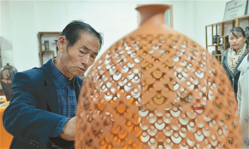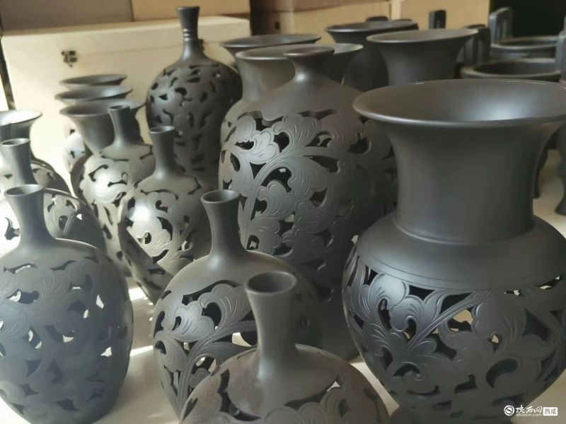已入不惑之年的刘建利是老人的二儿子,也是五陵塬黑陶的第十一代传承人,从小的耳濡目染和新一代人对艺术的理解,使他对黑陶有一种全新的认识,利用黄土高原黏土的细密,经过滤、拉型、雕刻、压光、烧制等现代工艺和传统陶瓷工艺生产加工,具有更高的艺术价值。他的一件镂空陶瓶曾在景德镇全国陶瓷赛事上获得铜奖,为陕西制陶业争得荣誉,成为独树一帜的“西北黑陶王”。