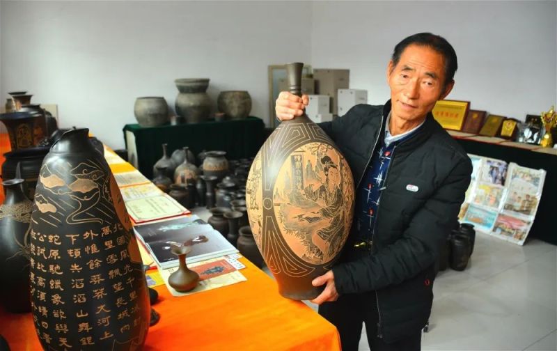 老人传承的五陵塬黑陶既有古陶纯朴自然之美,又开创现代陶艺夸张浪漫之风;既有新奇别致的优美造型,又有阴阳交错、变幻万千的神奇雕工。有黑如漆、声如罄、薄如纸、亮如镜、硬如瓷的美誉,又被誉为“黄土之宝”。