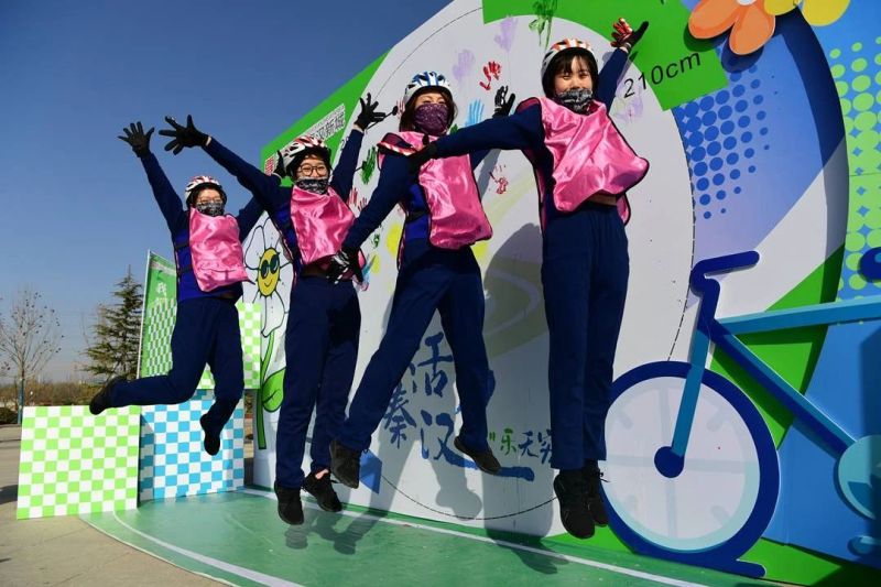 活动伊始,原创歌舞《月上兰池》用唯美的方式展示秦汉新城丰富的城市文化内涵。一段“拖拉机”热身操之后,随着一声长笛,骑行活动正式开始。大家鱼贯而出,冲出起跑线,沿着滨水慢道骑行。