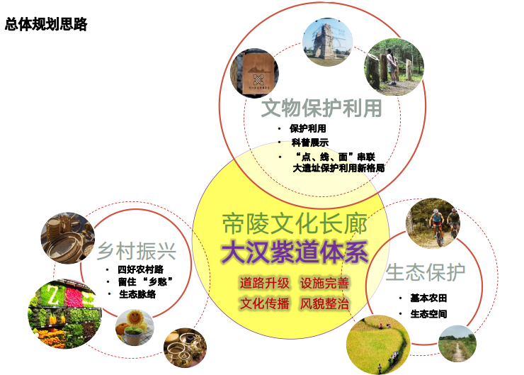 秦汉新城“大汉紫道”帝陵文化长廊项目,分为后四陵组团、张裕城堡过渡带、长陵-安陵组团、阳陵组团4个板块,将按照历史发展脉络,严格遵守文物和永久基本农田保护要求,以环境整治和景观提升为主,通过分级实施道路提升改造,设置综合性服务驿站和露营房车营地等方式,打造沉浸式品味历史文化、体验式感受自然之美、交互式带动活力村庄的多元特色廊道,展现“山-水-原-城-陵”格局和大遗址景观之美。