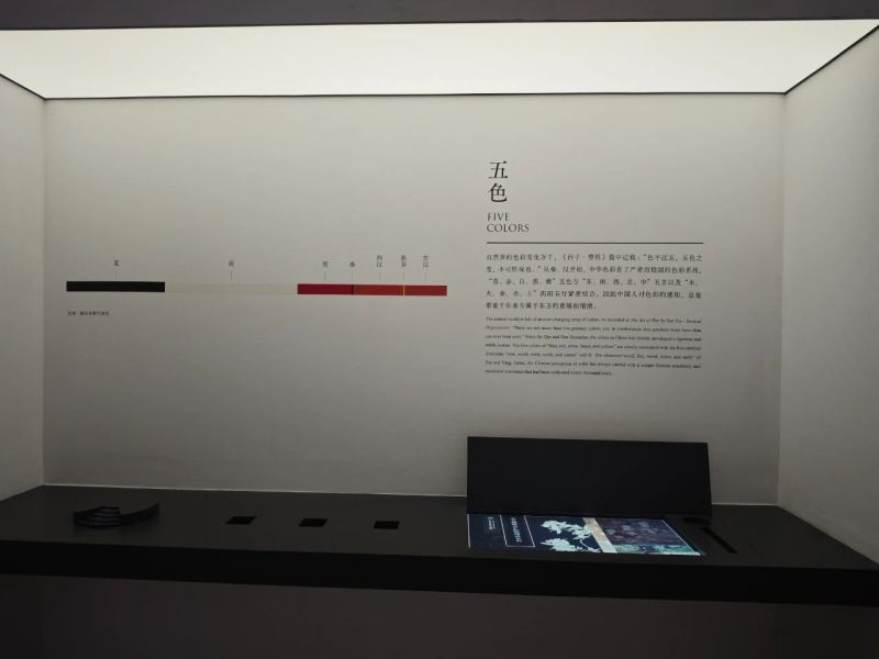 第一部分“五色中华”展区,策展方通过色彩的运用反映秦汉时期对和谐与美感的追求。用“建筑色彩”“器用色彩”“服饰色彩”中的“形与色”,向观众传达中国古代独特的色彩观念。展览的色彩设计基于秦汉时期的五色系统,用文物身上的“青、赤、黄、白、黑”5种基础色彩,展现古人对季节轮回、朝代更替的理解,反映文物所蕴含的五行方位和人生百态的哲学思考。