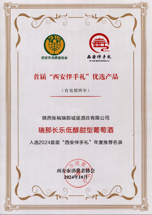 在日前举办的首届“西安有礼”伴手礼优选测评现场会上,54款产品被评为“西安有礼”首届西安伴手礼优选产品,其中包括陕西张裕瑞那城堡酒庄精心打造的“长乐”系列——瑞那长乐低醇甜型葡萄酒礼盒。