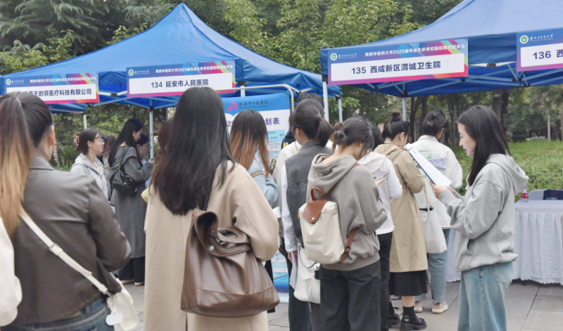 10月19日,气温骤降带来阵阵寒意,但陕西中医药大学南校区图书馆前却人头攒动,2025届毕业生秋季校园招聘月双选会在这里举办。