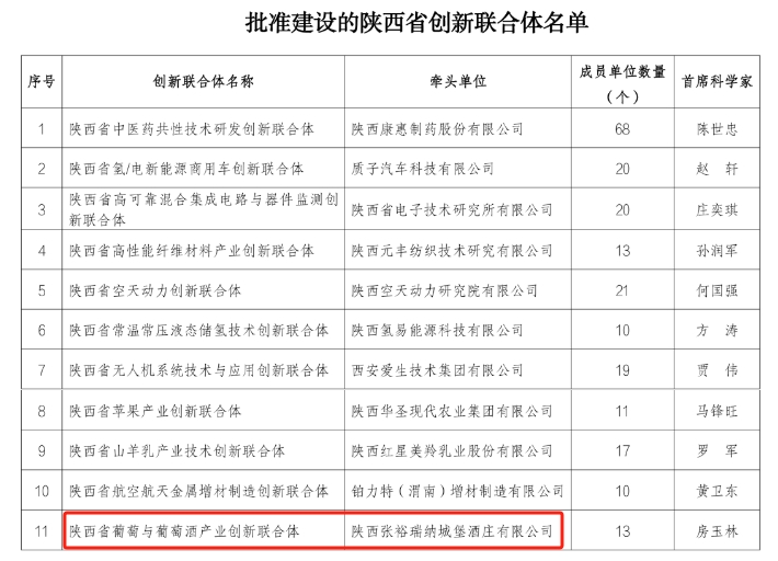 “陕西省葡萄与葡萄酒产业创新联合体”由陕西张裕瑞那城堡酒庄有限公司牵头,西北农林科技大学、西部果品资源高值利用教育部工程研究中心等13家单位共同建设。