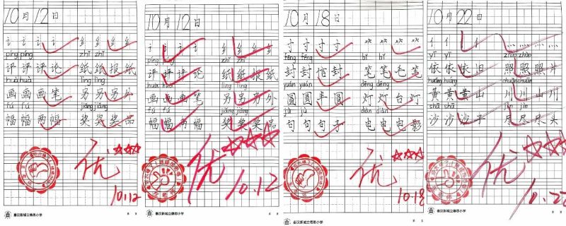 李荣说:“学校的习字教学坚持‘零起点’。孩子入学第一天起,老师就按照‘写字教学七到位’方法,从基本笔画开始指导他们练习,每周一节写字课,每天20分钟习字,同学们的书写水平提升非常快。”