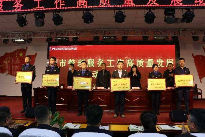 会上宣读了秦汉新城党委管委会《关于表彰2022年度目标责任考核优秀单位和优秀个人的决定》和综合行政执法支队《关于表彰2022年度目标责任考核优秀部门和优秀个人的决定》,并为先进部门和个人颁发荣誉证书,优秀员工代表上台表态发言。