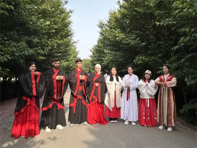 在汉阳陵樱花林,丝路青年身着汉服在讲解员的带领下体验汉朝礼仪以及汉代体育项目。作揖、顿首,在讲解员的耐心指导下,丝路青年津津有味地学习礼仪动作,感受中华民族作为礼仪之邦的悠久传承。在汉代,蹴鞠既是一种民间的娱乐活动,也是军队进行训练的重要手段,丝路青年围成圈相互传递蹴鞠,体验这项汉代时就成为全民运动项目的独特乐趣。投壶是中国古代士大夫宴饮时做的一种投掷游戏,也是一种礼仪,丝路青年手持箭矢向面前的壶中投掷,一支两支,在不断的尝试中终于有人将箭矢投入壶内,随即得到了周围人群的一阵掌声,欢声笑语在樱花林中回响。