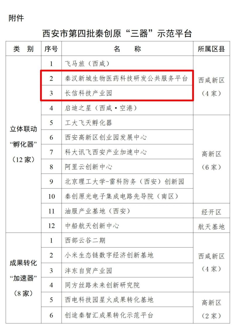 近日,西安市科学技术局发布第四、第五批西安市秦创原“三器”示范平台名单。秦汉新城生物医药科技研发公共服务平台、长信科技产业园、秦汉新丝路数字文化众创空间成功入选立体联动“孵化器”示范平台。