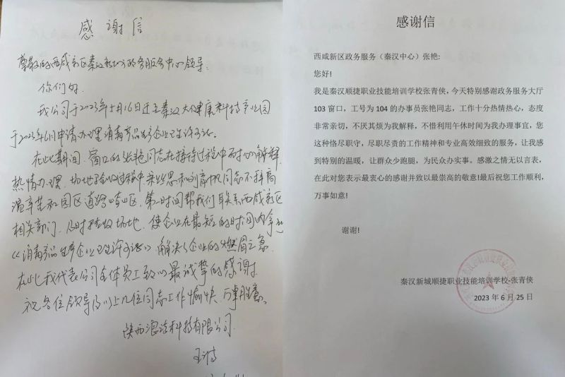 “政务服务大厅103号窗口人员,工作十分热情,态度非常亲切,为我不厌其烦解释办理流程,还利用午休时间为我办理许可证,让我感到非常暖心。”秦汉新城顺捷职业技能培训学校的张女士顺利办完业务后,特意送来一封感谢信,对负责办理业务的工作人员赞不绝口,直夸他们工作尽职尽责,服务专业细致。