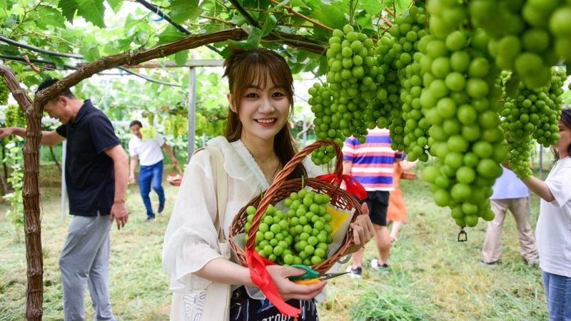 晶莹剔透的葡萄,似座座珍珠塔,如堆堆翡翠珠。开幕仪式结束后,葡小淘原生态葡萄苑正式开园,游人三三两两穿梭在一排排郁郁葱葱的葡萄架间,寻觅藏于园内的“宝藏”。步入葡萄采摘园,一串串红如玛瑙、紫如水晶的葡萄挂满枝头,果香四溢。在葡萄品鉴区,巨峰、夏黑、阳光玫瑰等多个品种葡萄依次排开,秦汉新城文明办工作人员将葡萄逐一摆好供游客品尝,让大家尽情感受沁人心脾的香甜。