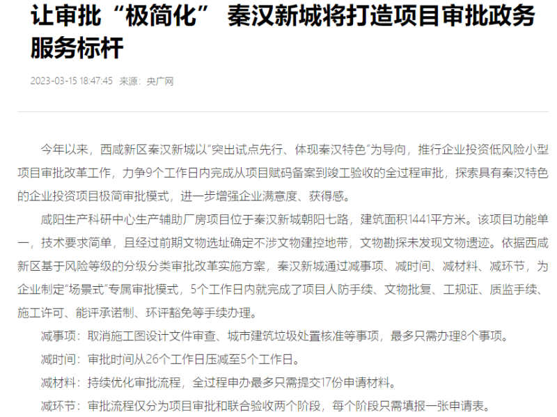 2023年,西咸新区秦汉新城深入学习贯彻党的二十大精神和习近平总书记来陕考察重要讲话重要指示精神,认真贯彻落实全省“三个年”活动、全市八个方面重点工作、新区打赢“五场硬仗”工作要求,抢抓西安北跨发展机遇,聚焦“三个带”发展目标,加快打造“服务质量优、审批效率优、要素保障优”的“三优”营商环境,构建“企业有需、我必有应”的全方位企业服务体系。