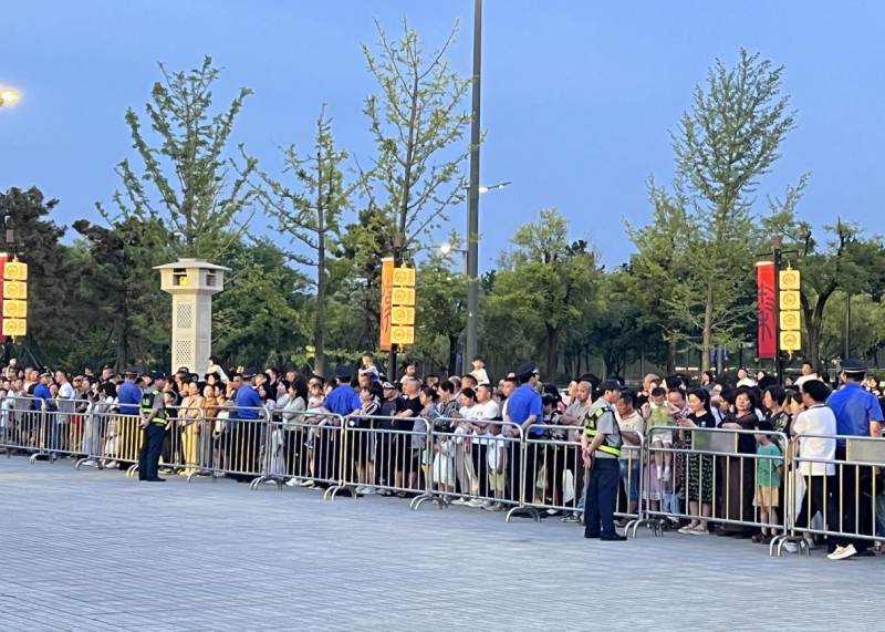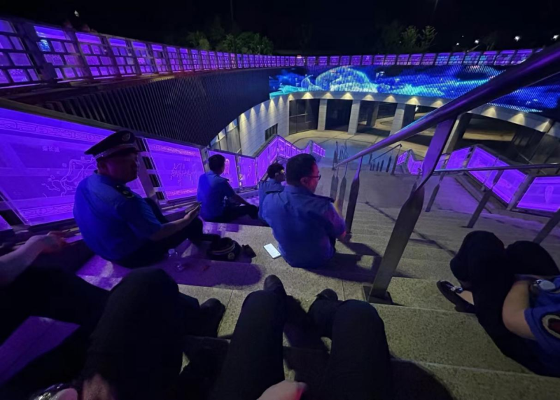 18:00:夜幕降临,参观游览人流量达到高峰,执法队员用脚步丈量大秦文明园,公园的每一个角落都有着“一抹蓝”保护着前往游玩的群众安全。