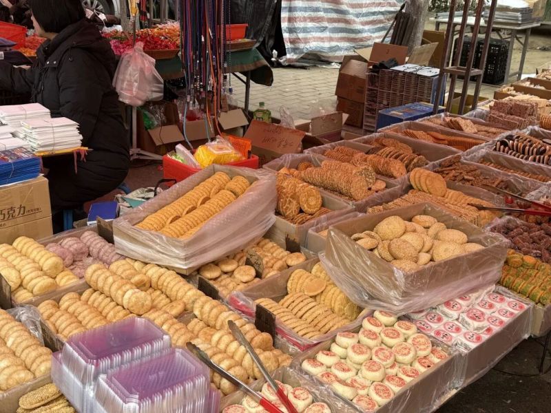 陕西特色酥饼层层起酥、甜咸适口,蓼花糖金裹银缠、甜脆绵软,八角、桂皮、花椒等调味香料整齐码放,花生、瓜子、核桃等坚果满满当当,果丹皮、石头饼等怀旧小零食更是一应俱全,每一口都是独属于集市的烟火与香甜,也藏着儿时的年味记忆。