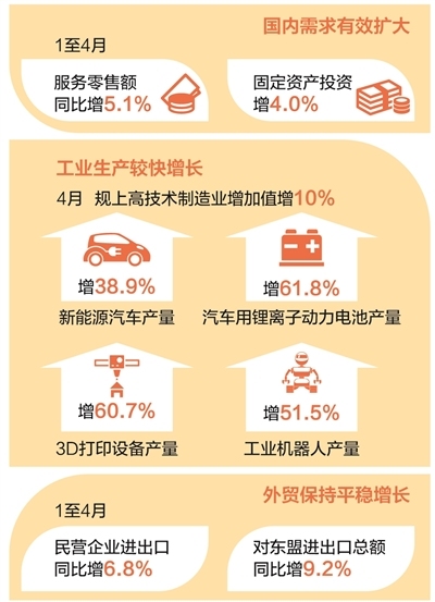 透过成绩单,可以看到内需为主导、内部可循环的大国经济独有优势。需求端,4月份,随着提振消费专项行动深入开展、“两新”政策加力扩围实施,消费、投资等需求有效释放。供给端,新能源汽车、工业机器人等产品产量增势明显,人工智能大模型等科技前沿领域加快突破,显示工业生产稳中有进、新质生产力茁壮成长。总体看,我国产业体系完备、市场空间广阔,国内大循环具有内在稳定性、长期成长性,为对冲国际循环的不确定性提供了有利条件。扩大内需、优化供给,中国经济将在供给与需求的更高水平动态平衡中平稳向前。