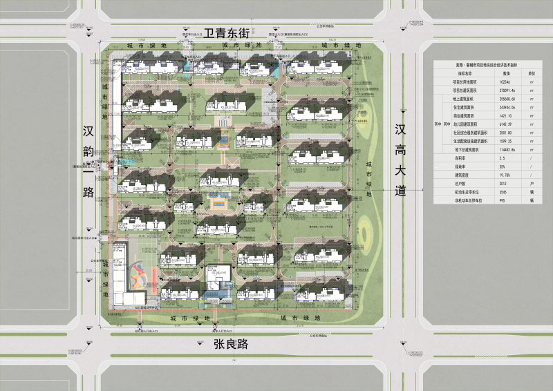 项目位于秦汉新城汉韵一路以东、卫青东街以南、汉高大道以西、张良路以北区域。本项目规划净用地面积102246㎡,总建筑面积370091.46㎡,主要建设住宅、幼儿园、配套商业及相关公建。详见总平面示意图。