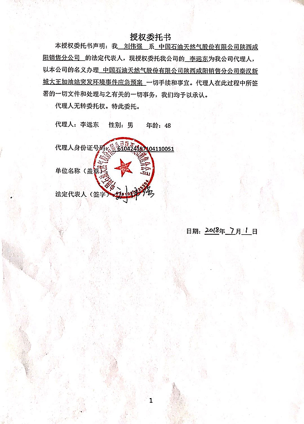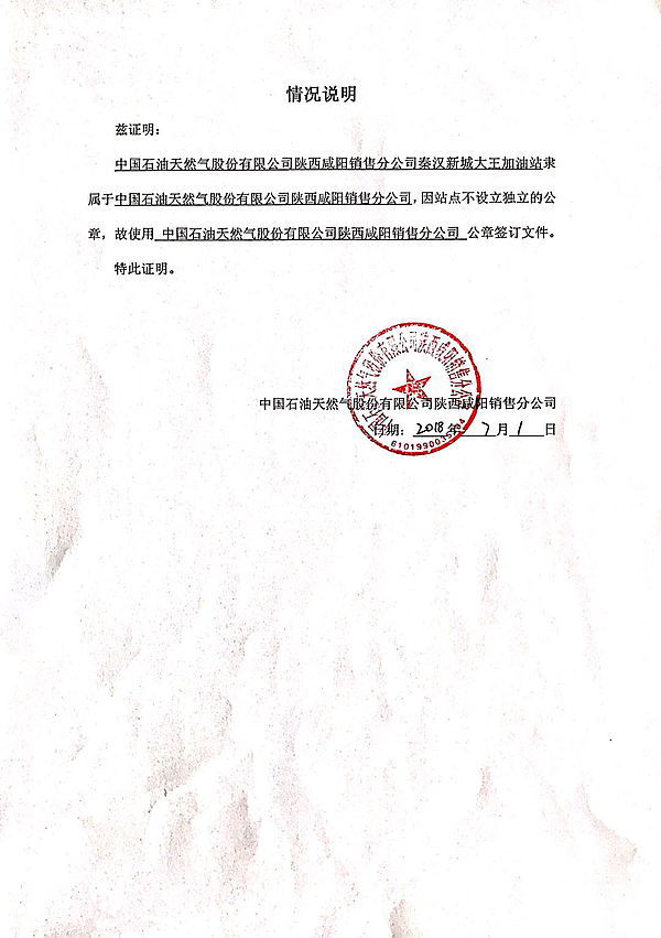 关于2018年9月7日中国石油天然气股份有限公司陕西咸阳销售分公司秦汉新城大王加油站