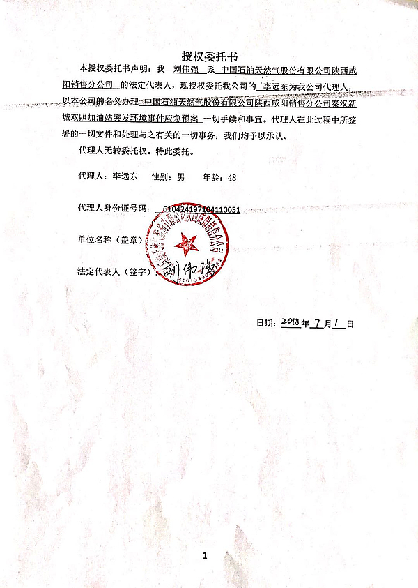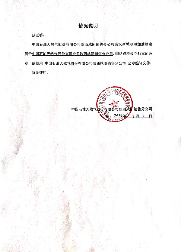 关于2018年9月7日中国石油天然气股份有限公司陕西咸阳销售分公司秦汉新城双照加油站