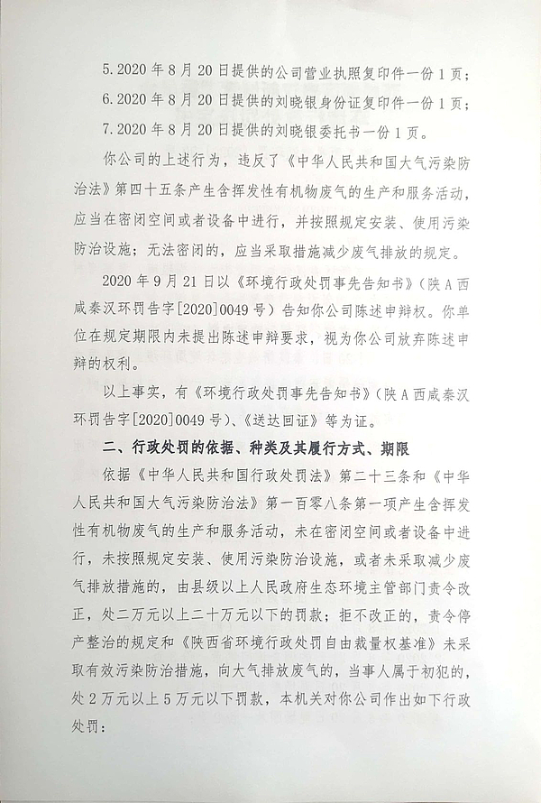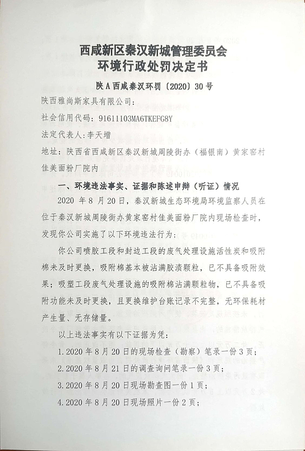 陕西雅尚斯家具有限公司环境行政处罚决定书