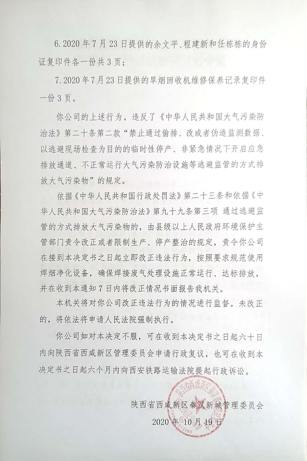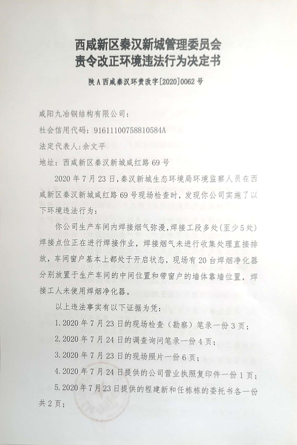 咸阳九冶钢结构有限公司责令改正环境违法行为决定书