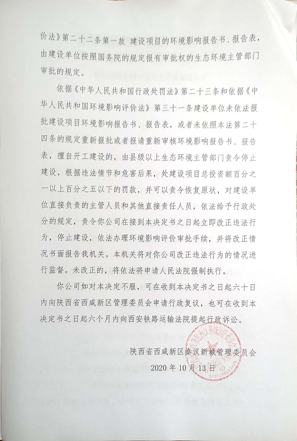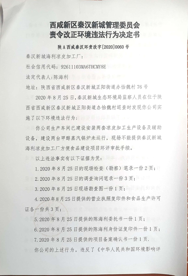 秦汉新城海利凉皮加工厂责令改正环境违法行为决定书