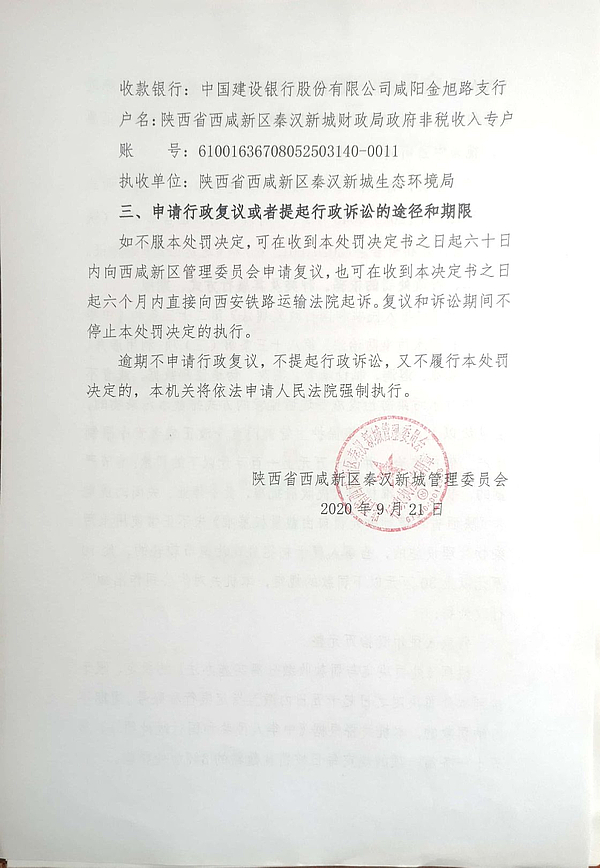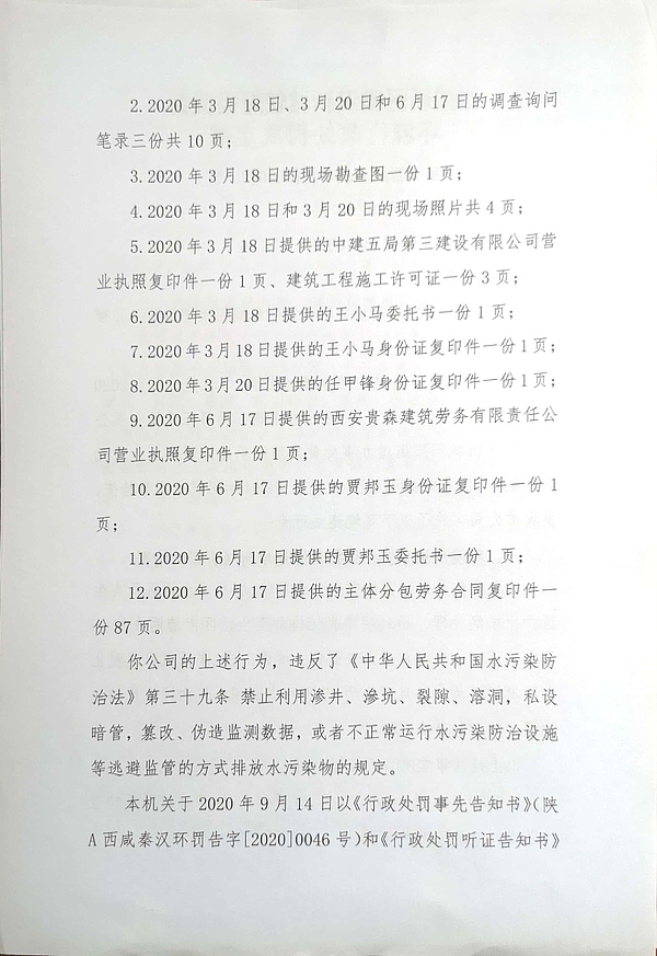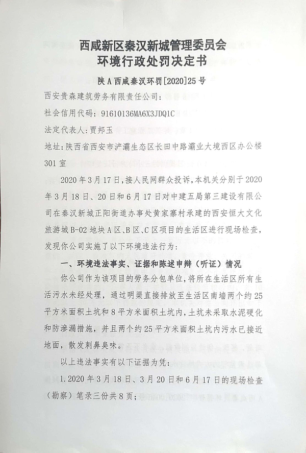 西安贵森建筑劳务有限责任公司环境行政处罚决定书