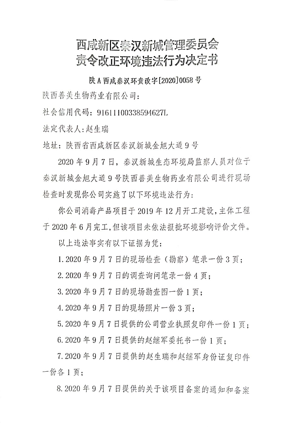 陕西善美生物药业有限公司责令改正环境违法行为决定书