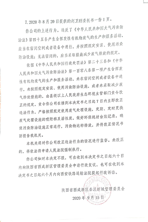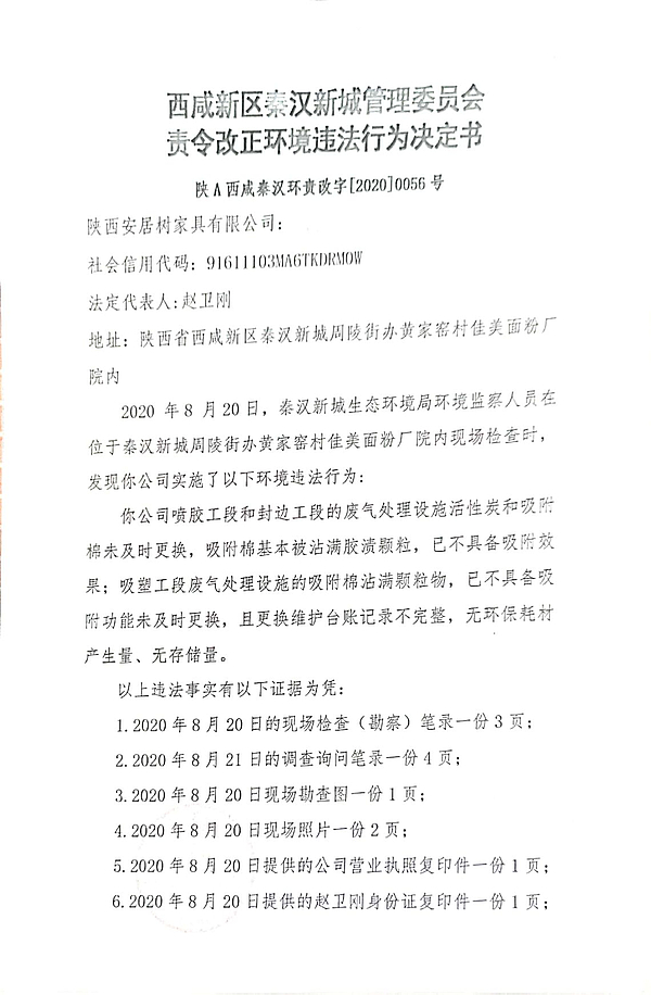 陕西安居树家具有限公司责令改正环境违法行为决定书
