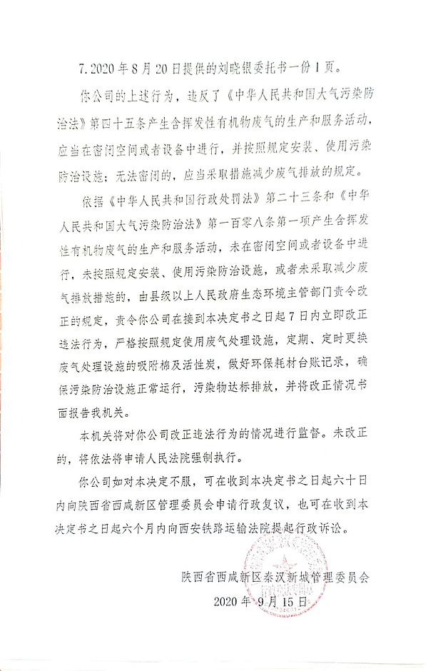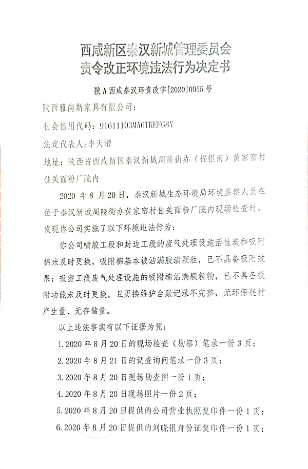 陕西雅尚斯家具有限公司责令改正环境违法行为决定书