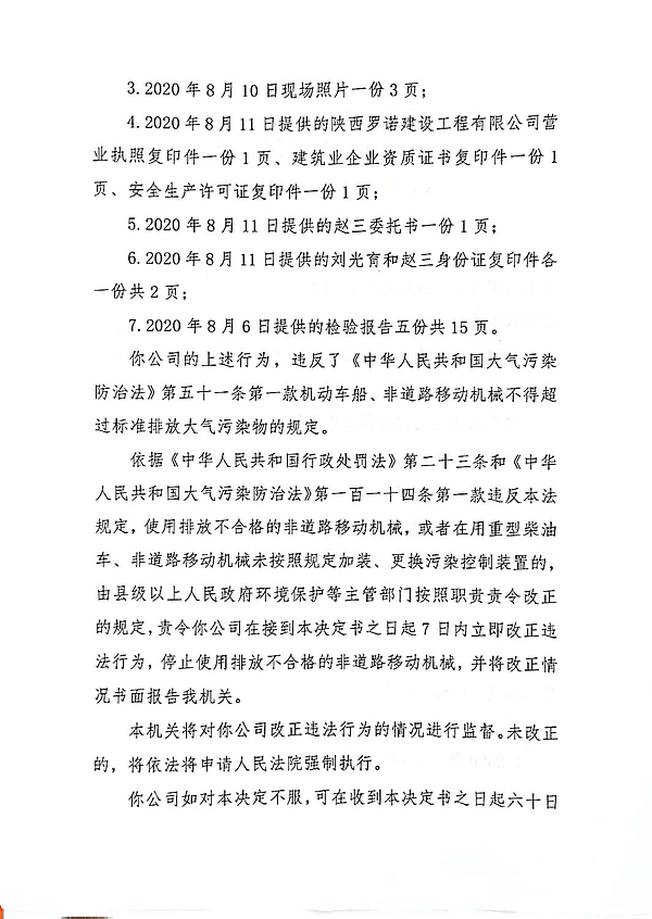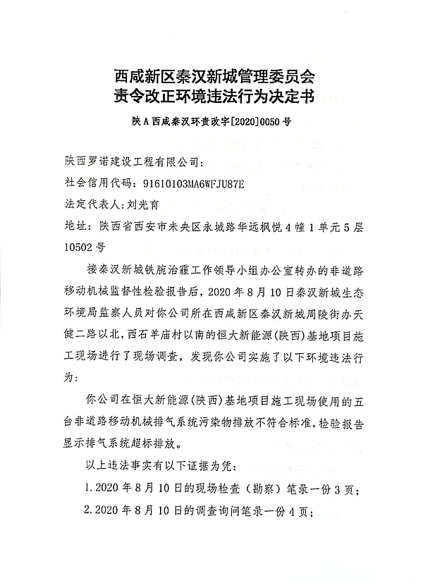 陕西罗诺建设工程有限公司责令改正环境违法行为决定书