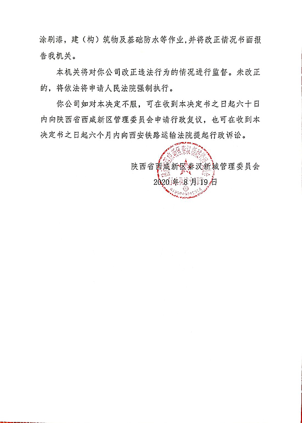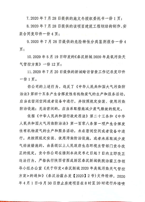陕西火花钢结构有限公司责令改正环境违法行为决定书