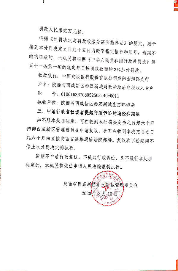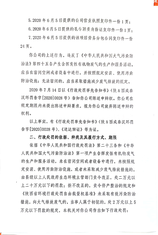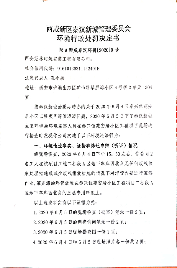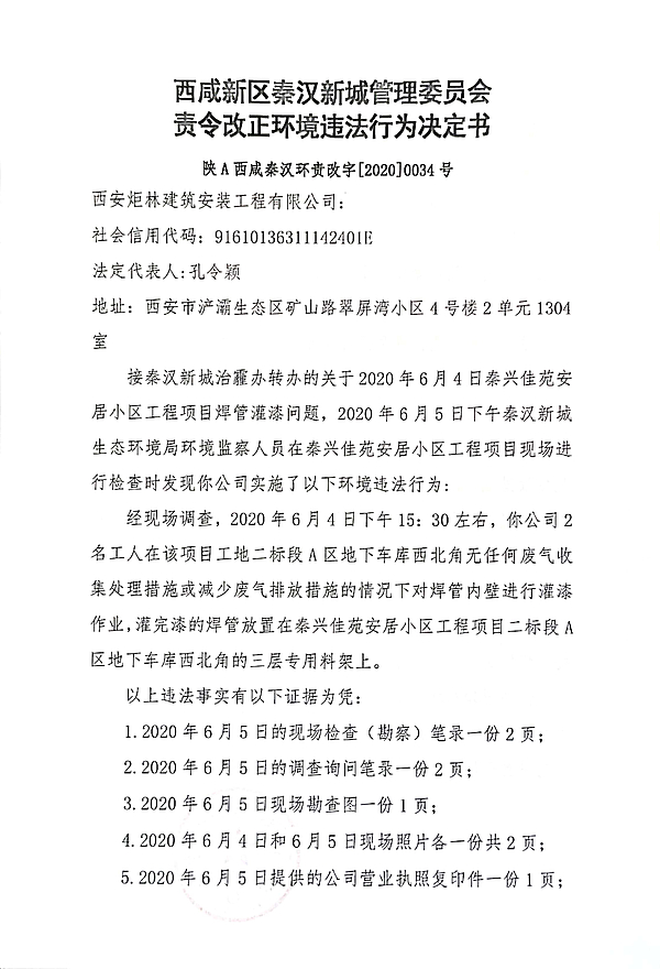 西安炬林建筑安装工程有限公司责令改正环境违法行为决定书和环境行政处罚决定书