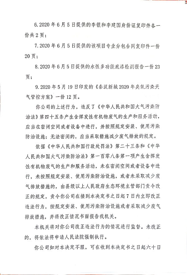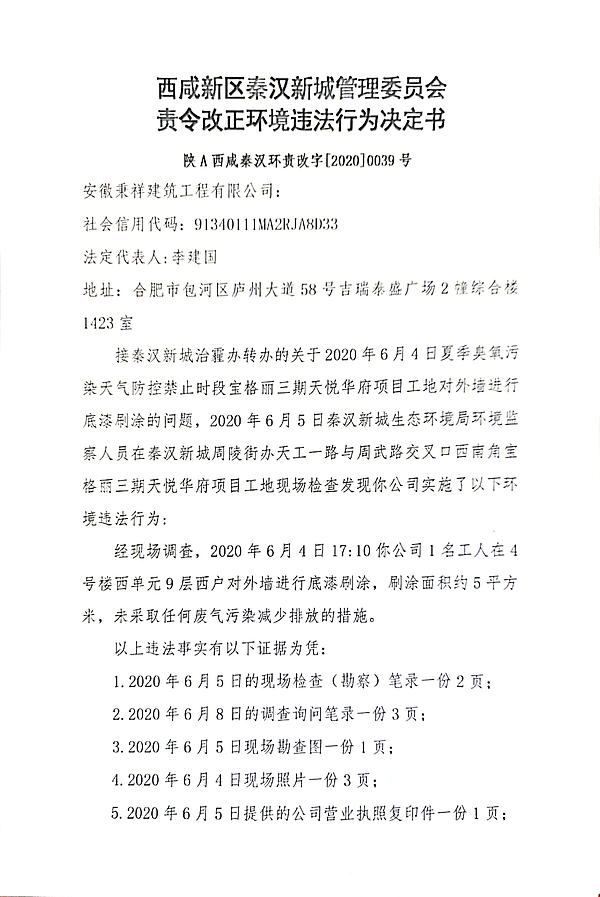 安徽秉祥建筑工程有限公司责令改正环境违法行为决定书