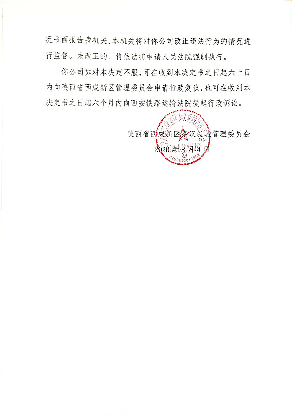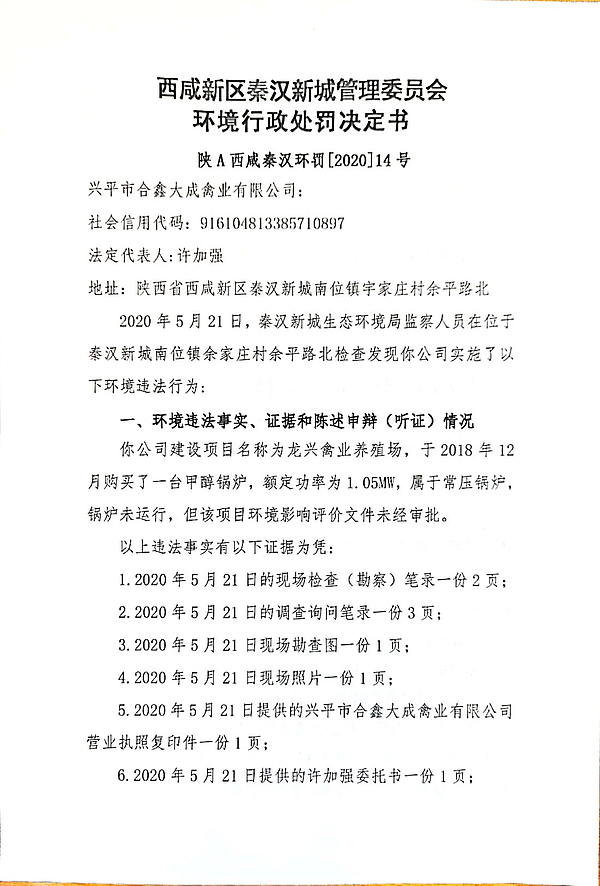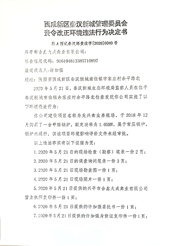 兴平市合鑫大成禽业有限公司环境行政处罚决定书和责令改正环境违法行为决定书
