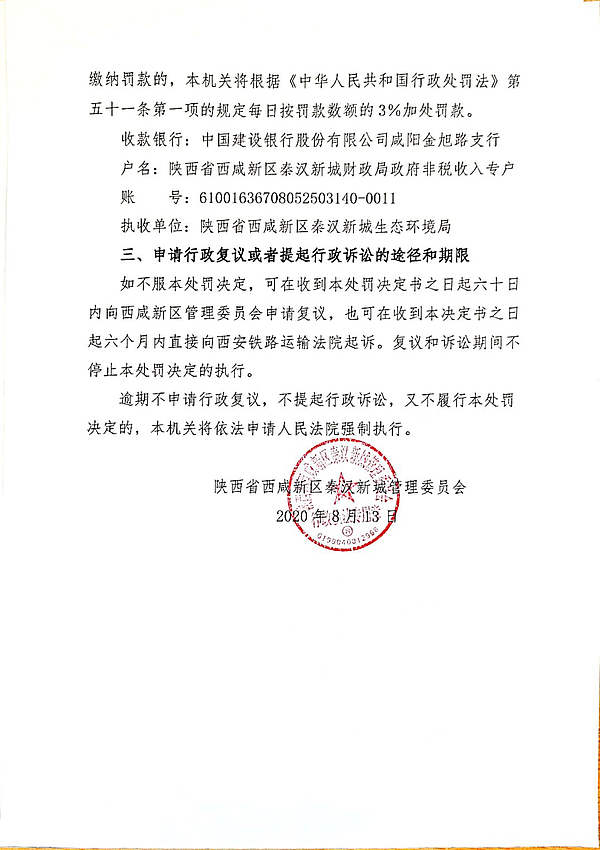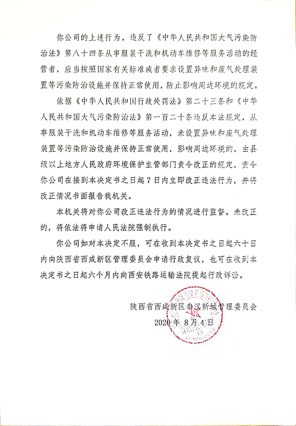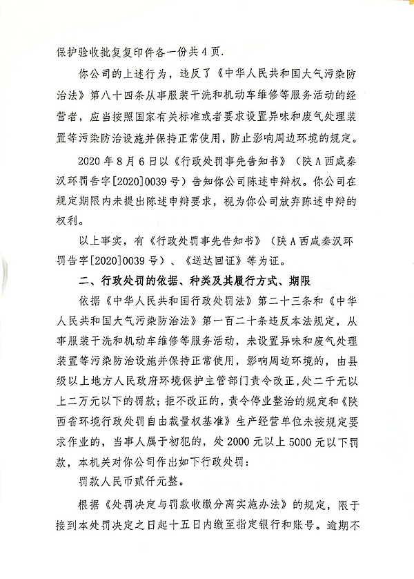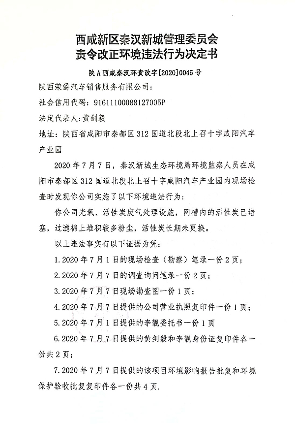 陕西荣爵汽车销售服务有限公司环境行政处罚决定书和责令改正环境违法行为决定书
