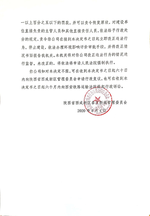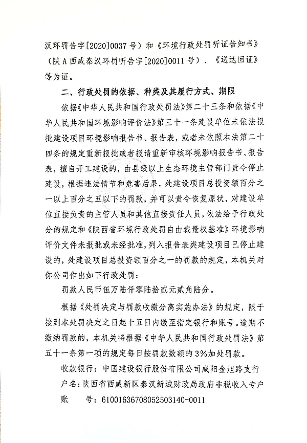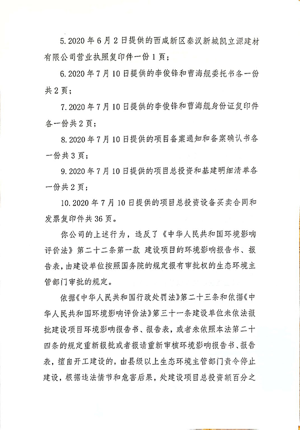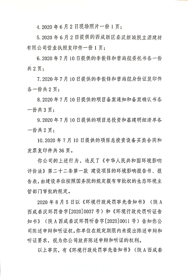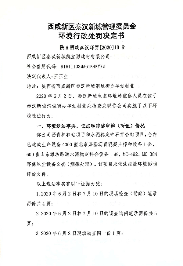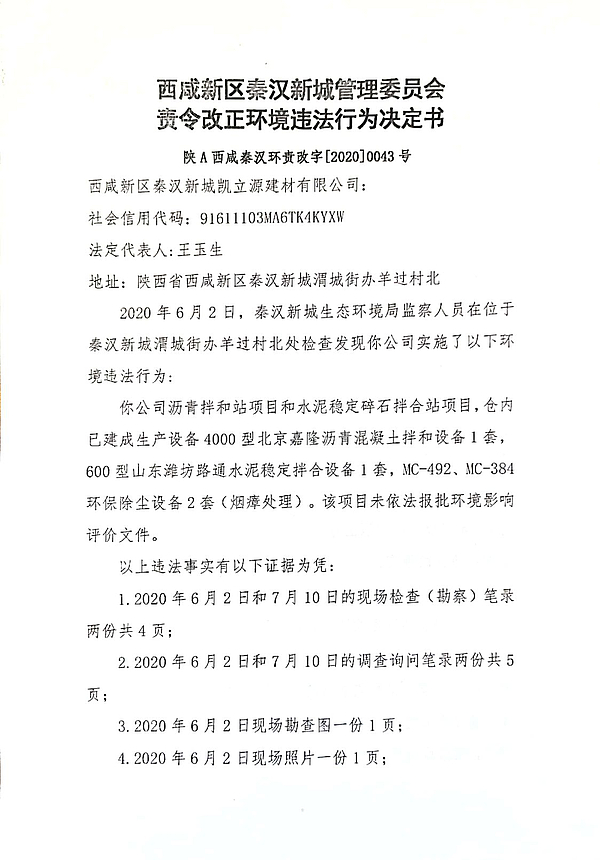 西咸新区秦汉新城凯立源建材有限公司责令改正环境违法行为决定书和环境行政处罚决定书