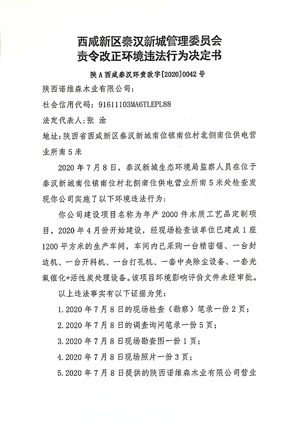 陕西诺维森木业有限公司责令改正环境违法行为决定书