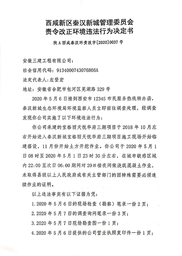 安徽三建工程有限公司责令改正环境违法行为决定书