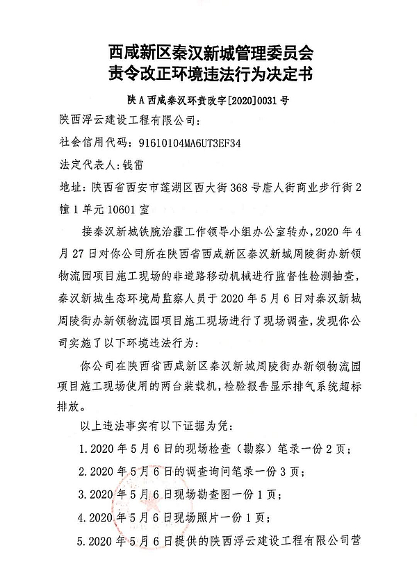 陕西浮云建设工程有限公司责令改正环境违法行为决定书