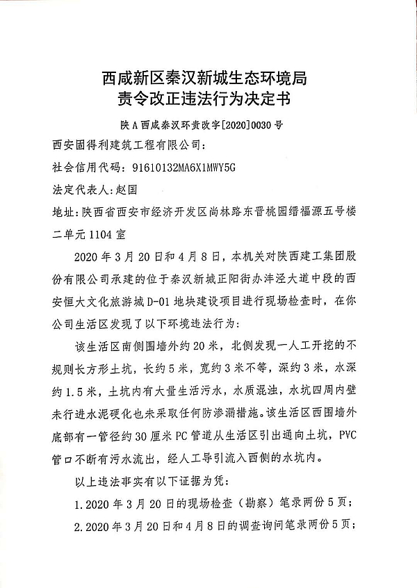 西安固得利建筑工程有限公司责令改正违法行为决定书