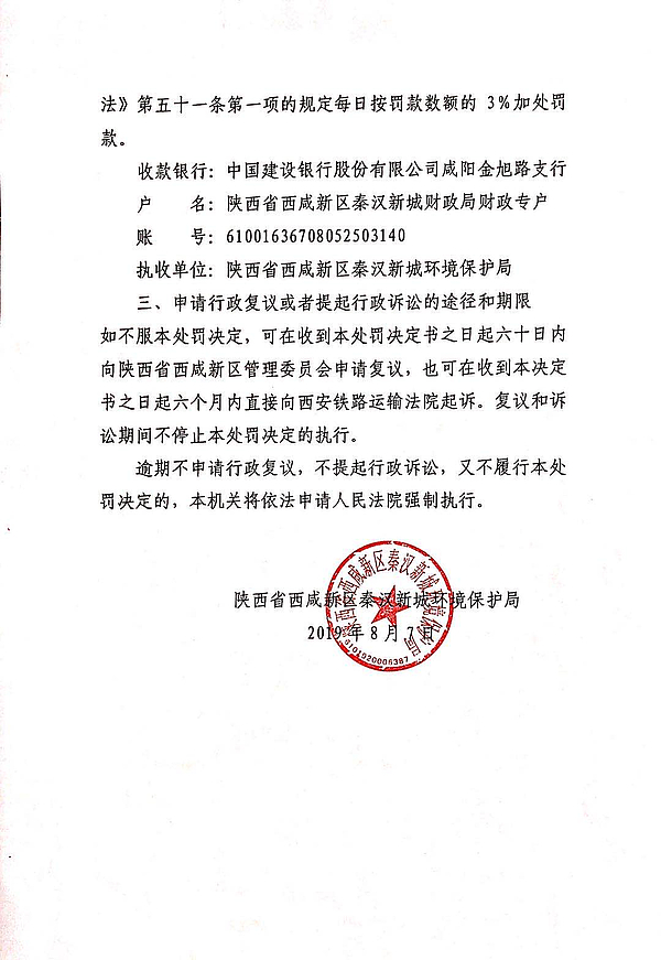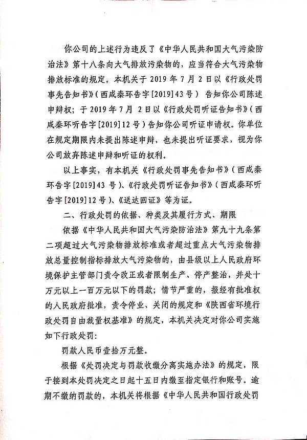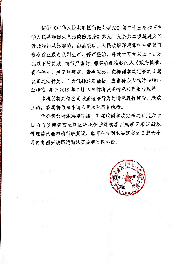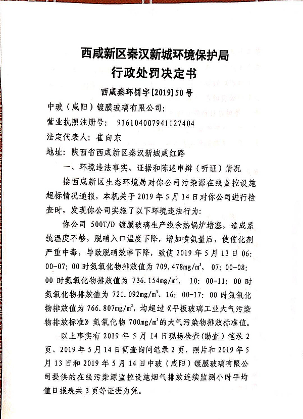 中玻(咸阳)镀膜玻璃有限公司行政处罚决定书和责令改正违法行为决定书