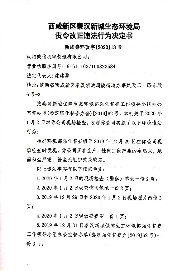 咸阳荣信机电制造有限公司责令改正违法行为决定书