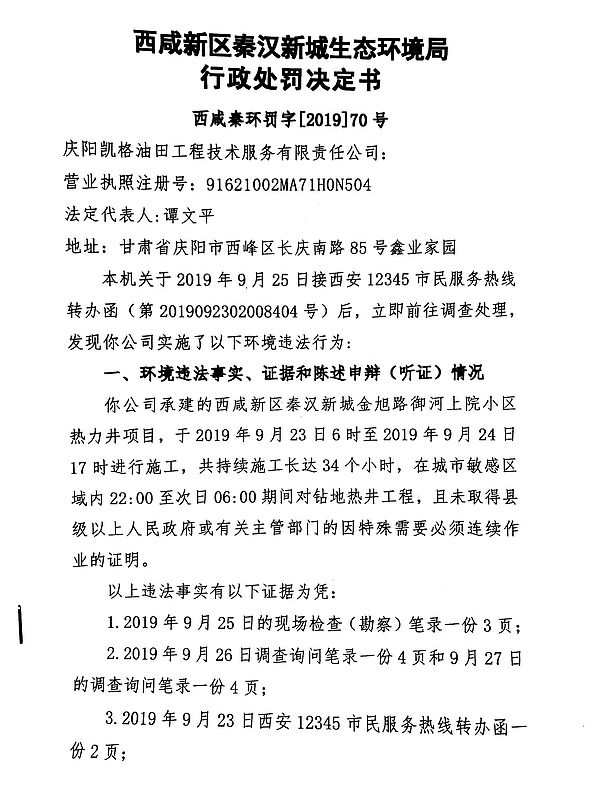 庆阳凯格油田工程技术服务有限责任公司行政处罚决定书