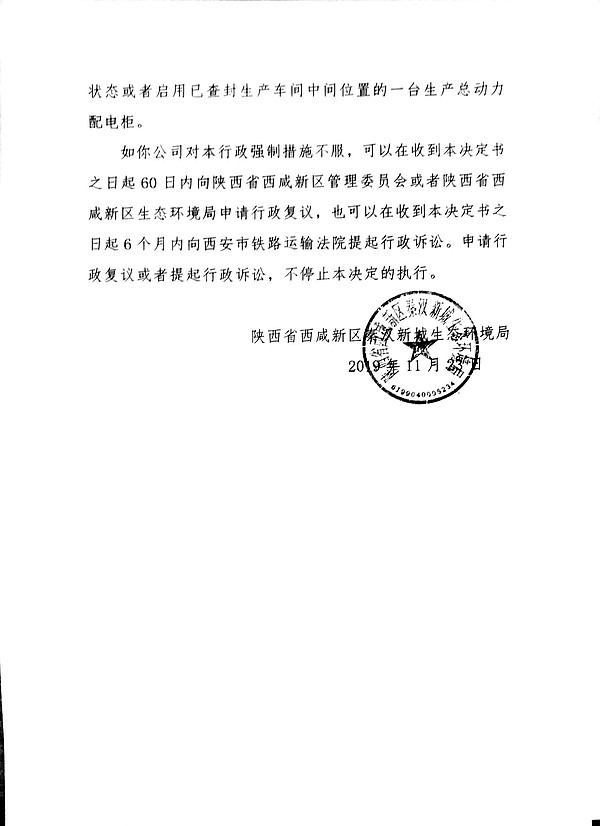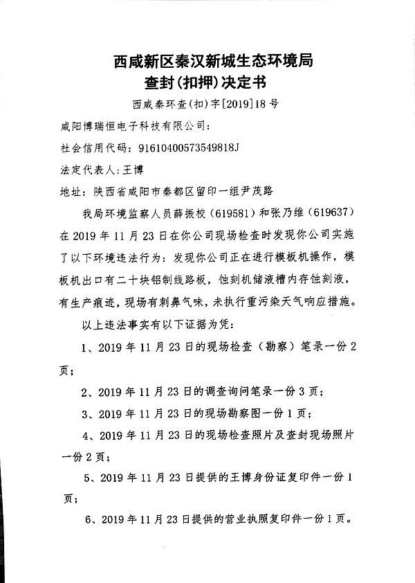 咸阳博瑞恒电子科技有限公司查封(扣押)决定书