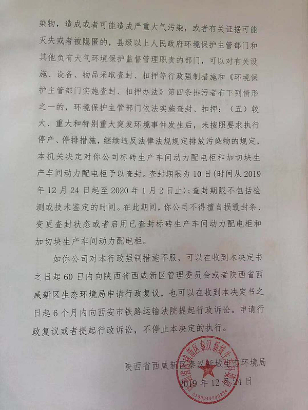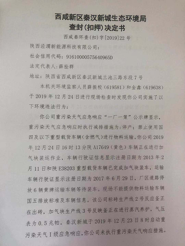 陕西泾渭新能源科技有限公司查封(扣押)决定书