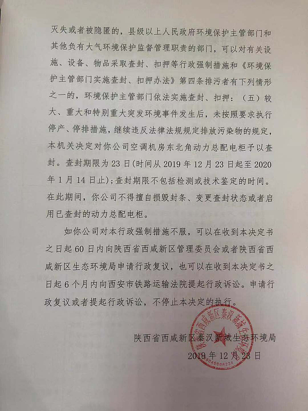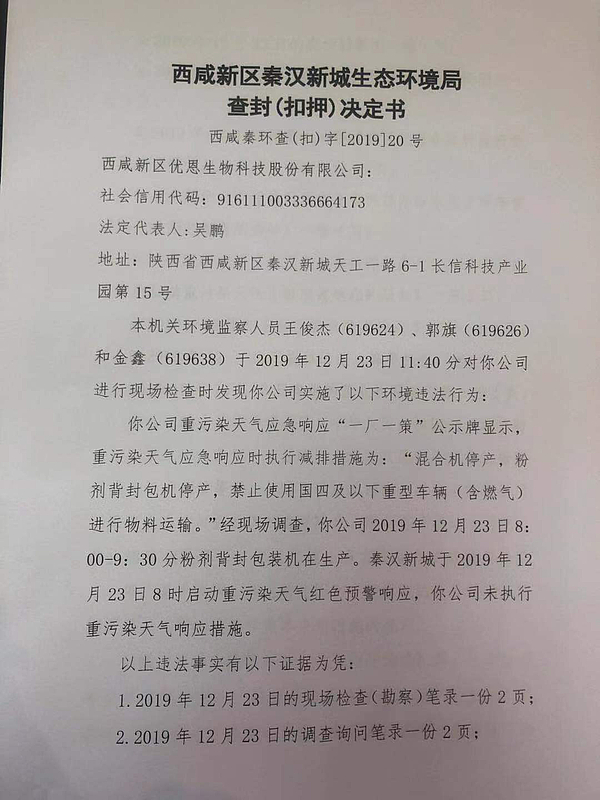 西咸新区优恩生物科技股份有限公司查封(扣押)决定书